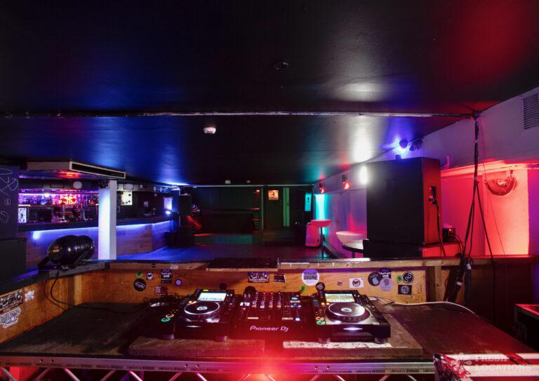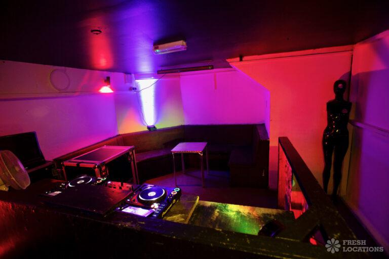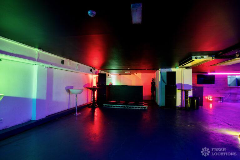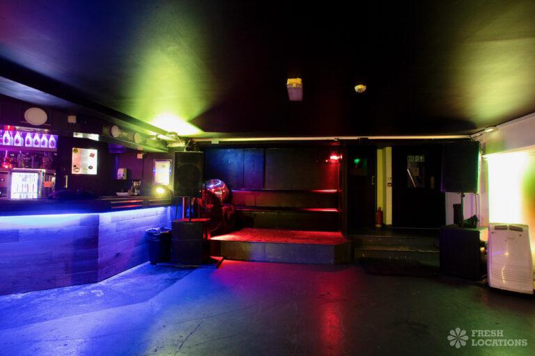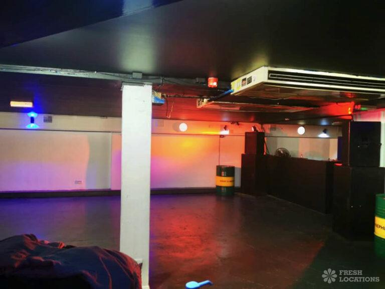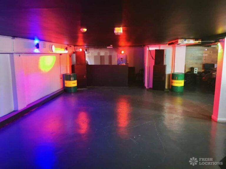 StaircaseBasement bar in Stoke Newington. Shoot location featuring concrete floors, pillars, bar and dance floor. London Borough of Hackney.