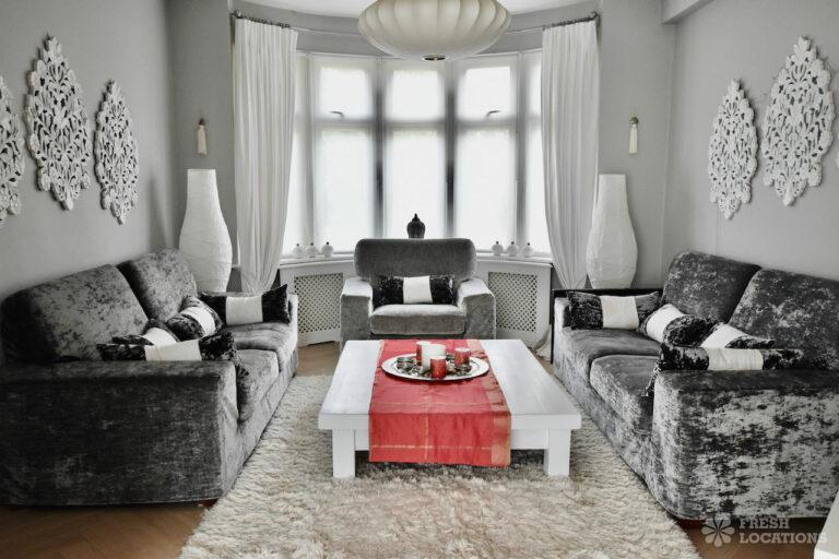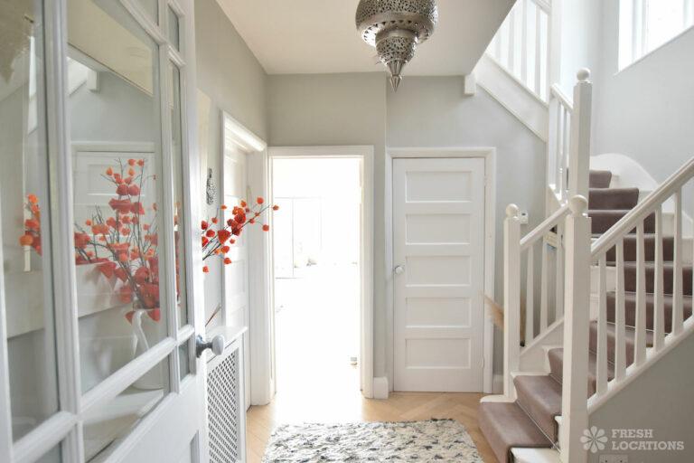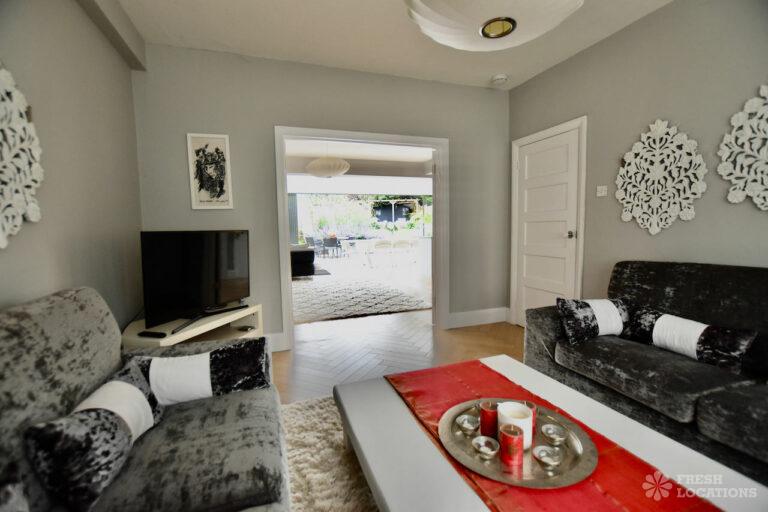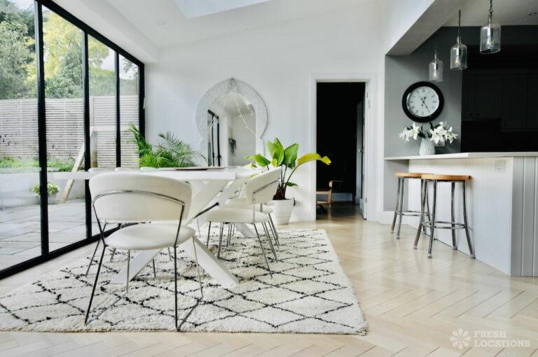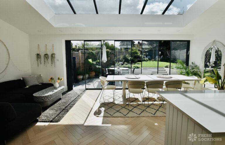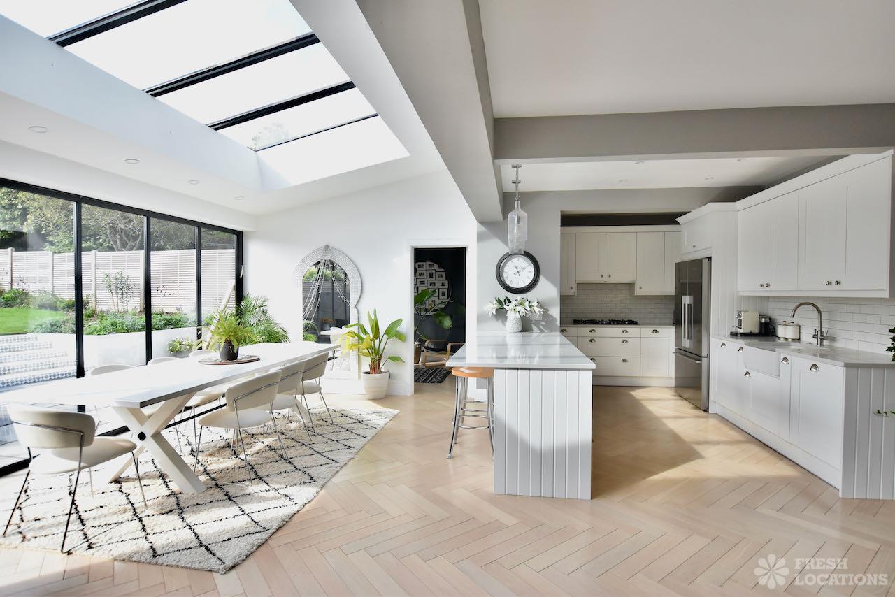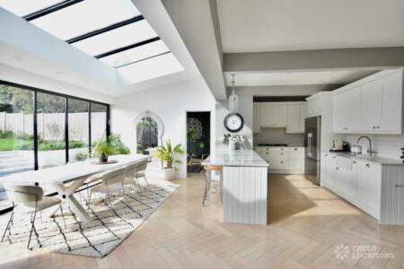 Light Wood Floor, Bay Window, Driveway, Garden, Gas Hob, Home Office, Large Kitchen, Parquet Floor, Skylights, Staircase, Tiled Floor, Wood FloorsA spacious and bright semi-detached house in North London. The open plan kitchen/dining space has plenty of light provided by the large siding doors and skylights. There are multiple lounge areas, which are ideal for shoots that require multiple set ups. London Borough of Barnet.