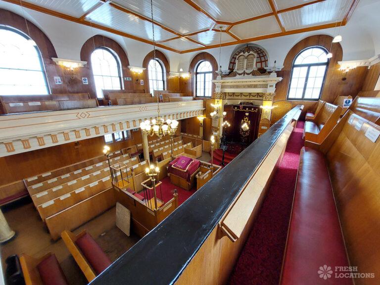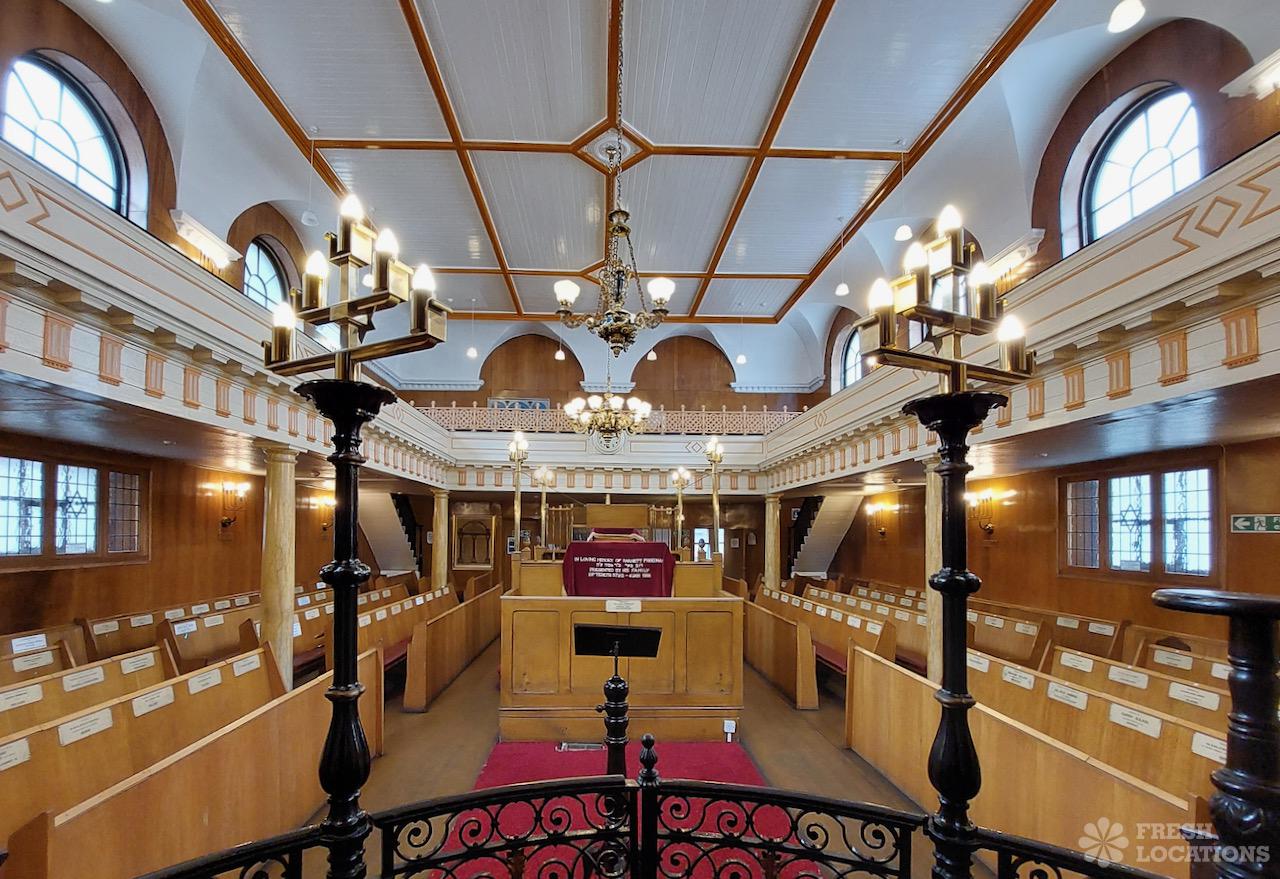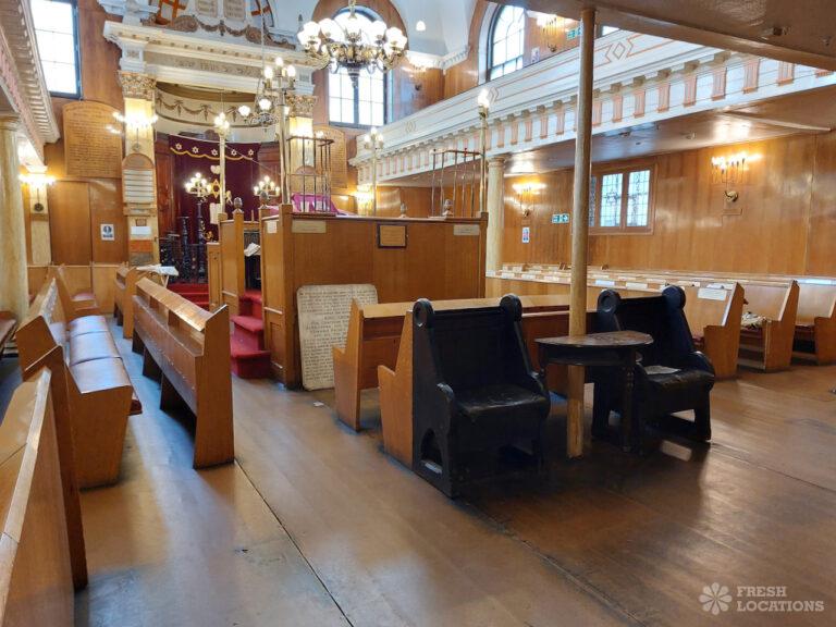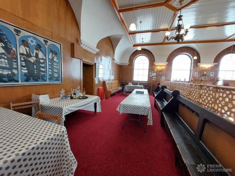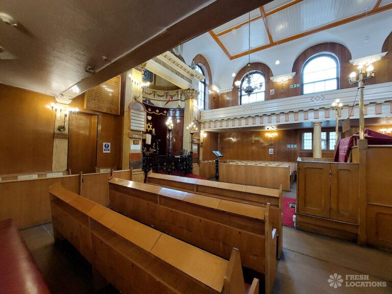 Beautiful synagogue shoot location in East London. Built in the mid 1800s, featuring wood floors, high ceilings and pillars. London Borough of Tower Hamlets.