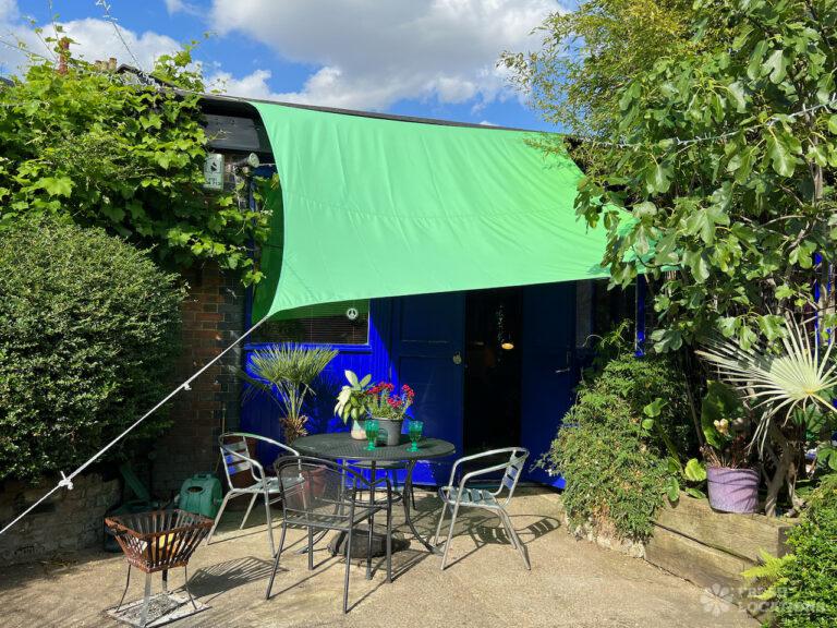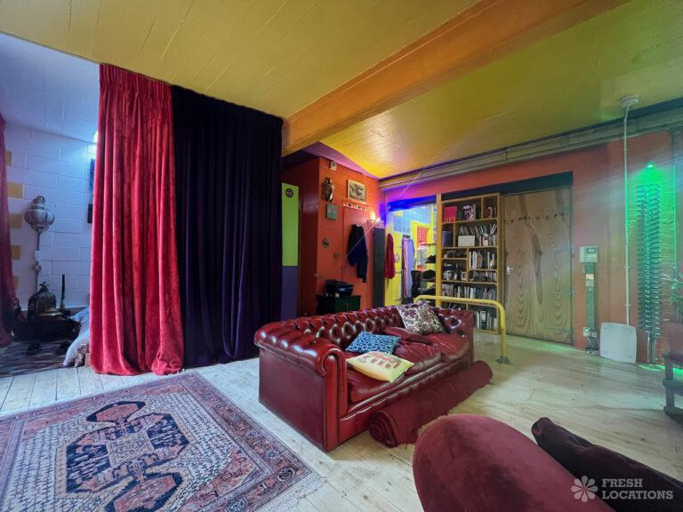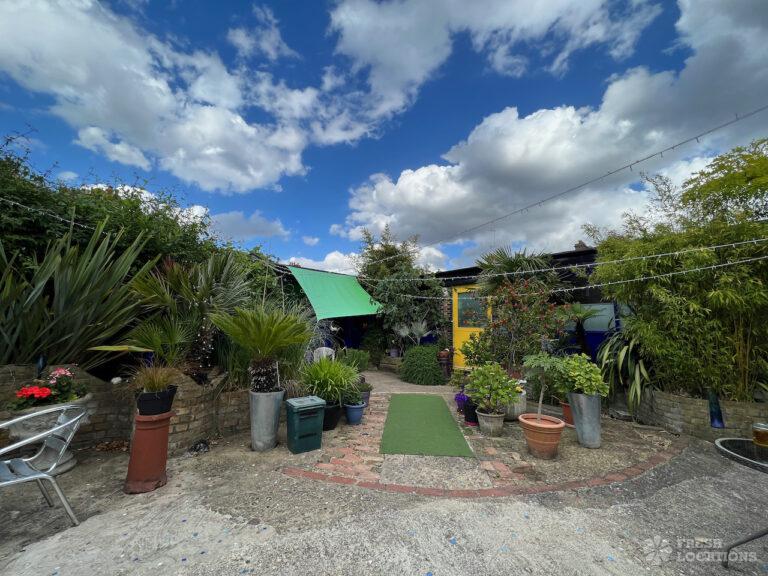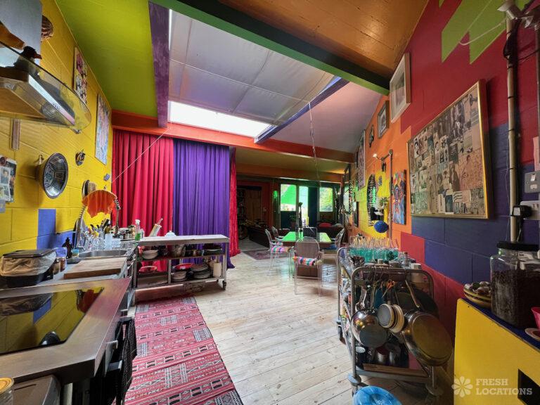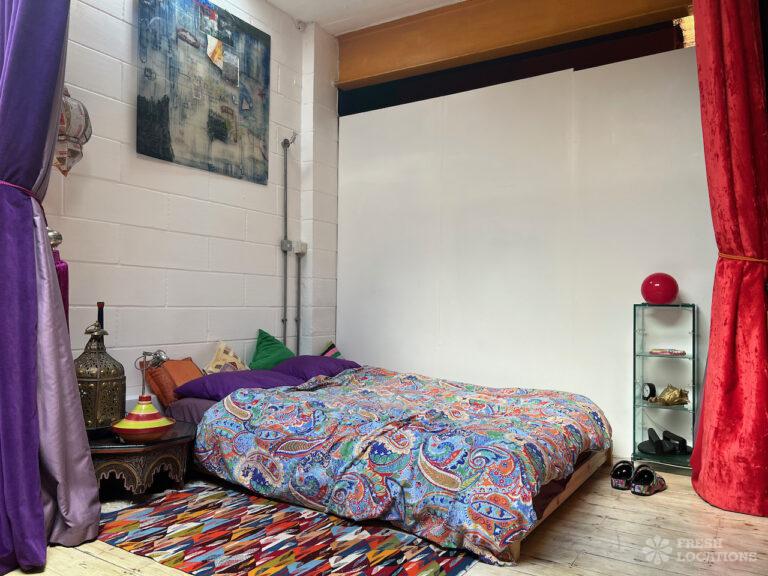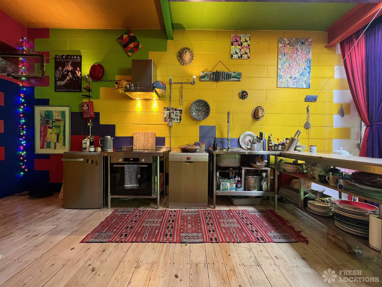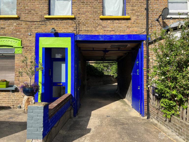 Wood Floors, Courtyard, Driveway, Garden, Light Wood Floor, Open Plan, Skylights, Tiled Floor, Walk In ShowerColourful and industrial studio apartment in North London. Open plan space with a kitchen, dining area, bedroom and shower. London Borough of Haringey.