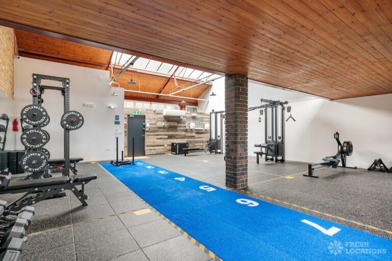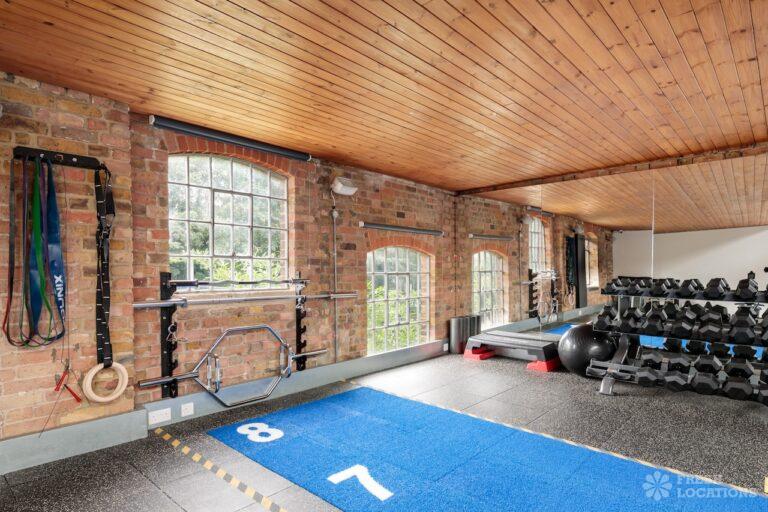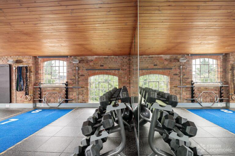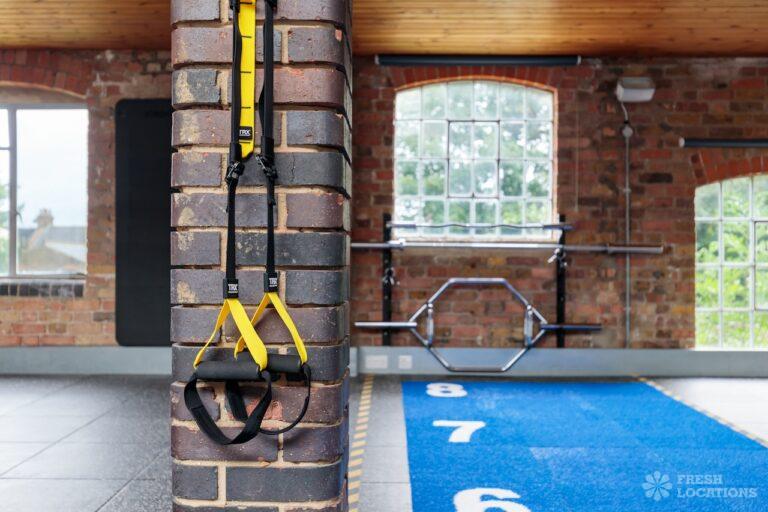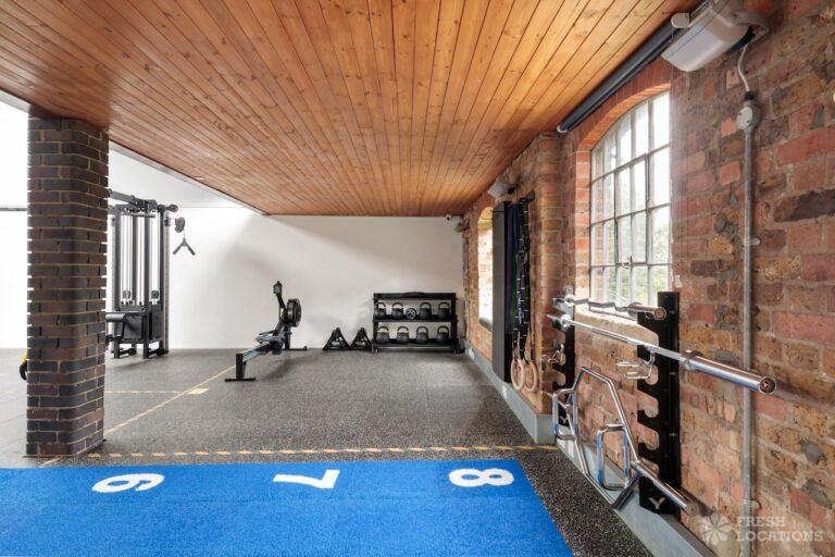 Fitness gym shoot location in North West London. Large, open plan space with exposed brick and high ceilings. London Borough of Brent.