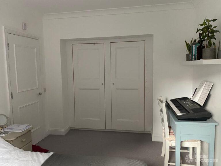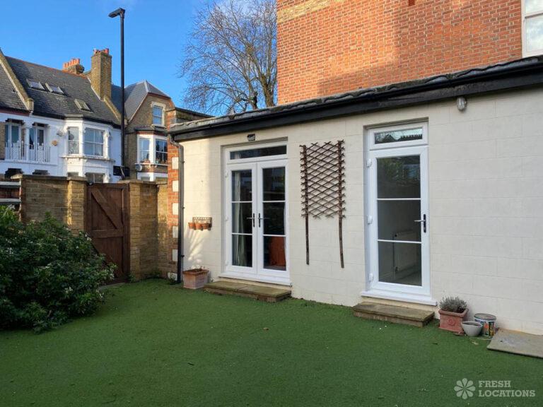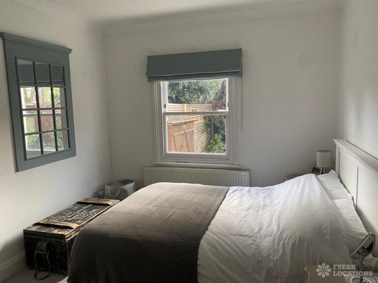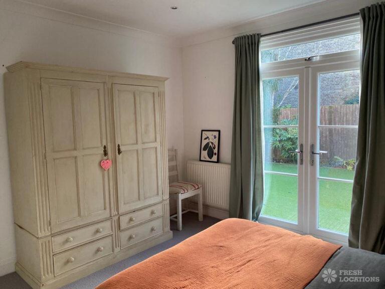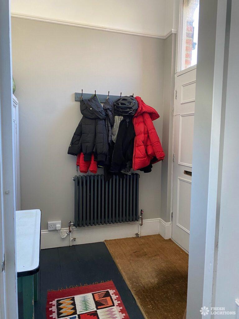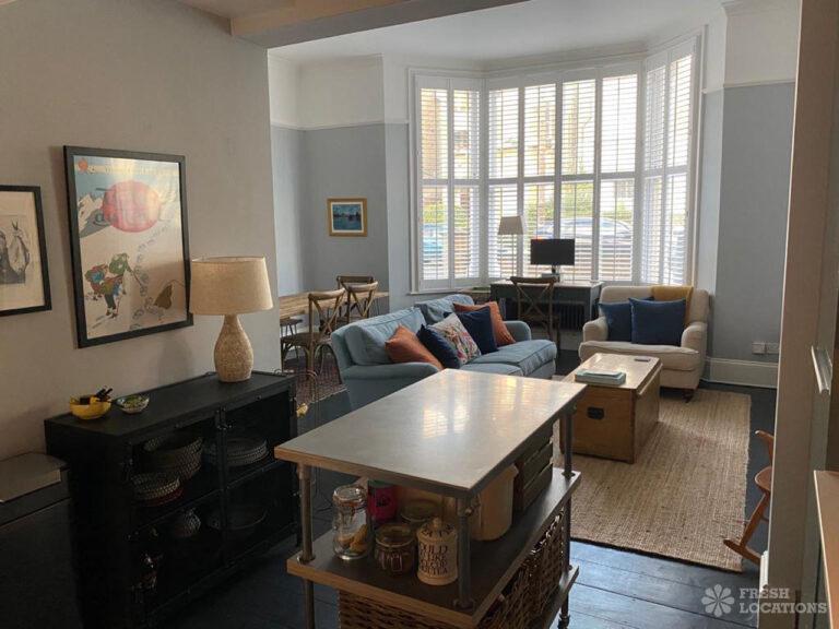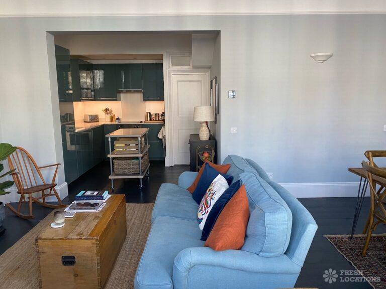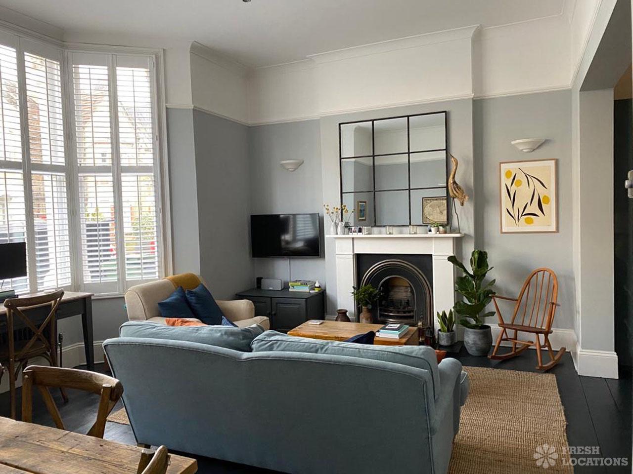 Ground floor apartment shoot location in South East London. Open plan kitchen living area with dark wood floors and a lovely fireplace. London Borough of Lambeth.
