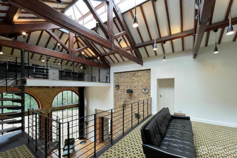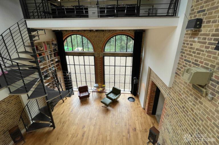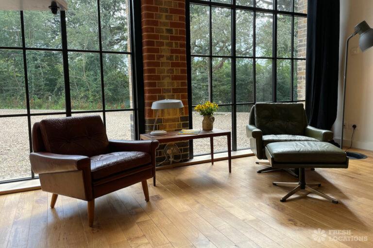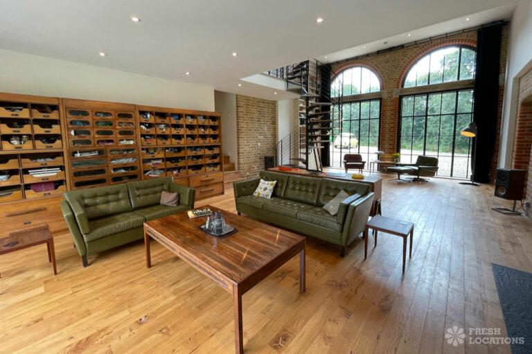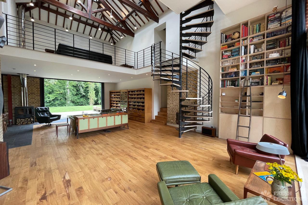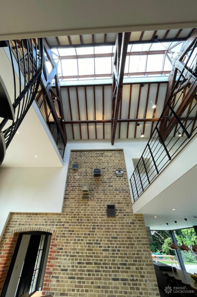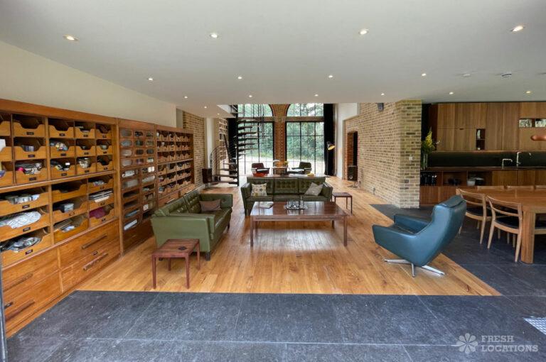 Wood Floors, Crittall, Driveway, Exposed Beams, Exposed Brick, Fireplace, Full Height Windows, Garage, Garden, Home Office, Inglenook Fireplace, Large Driveway, Large Garden, Multiple Bathrooms, Multiple Bedrooms, Multiple Living Rooms, Open Plan, Open Staircase, Spiral Staircase, Staircase, Tiled FloorThis shoot location is a converted Victorian water pumping station with a mid century interior style. There is a double height vaulted ceiling, with two mezzanine levels looking onto the open plan living area. The full height sliding doors provide ample light in to the kitchen, where there is a stylish elongated island/dining table. There are five bedrooms within this property, and four bathrooms. Set on two acres of garden and woodland, this property is located in Hertfordshire.