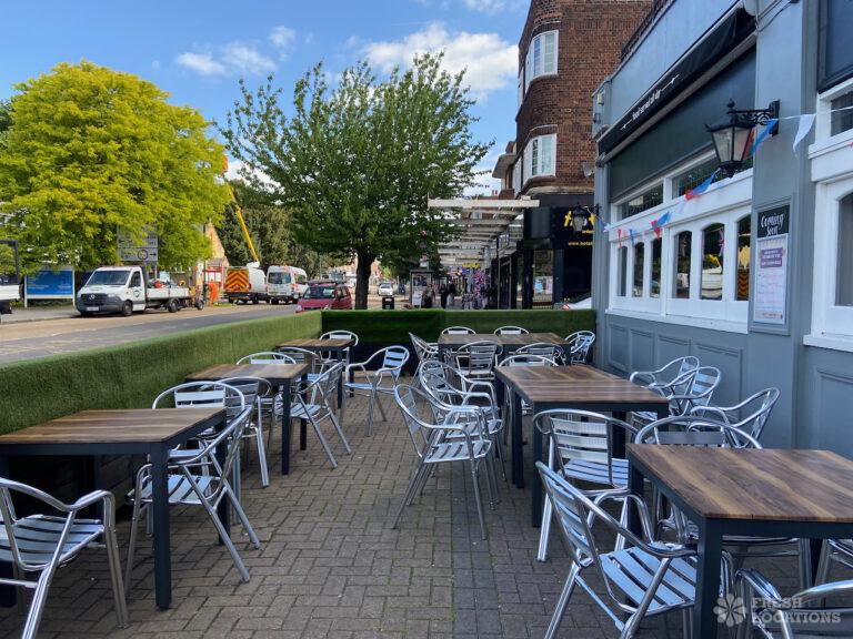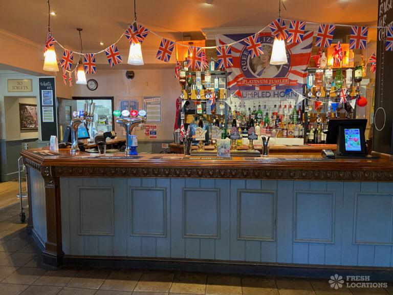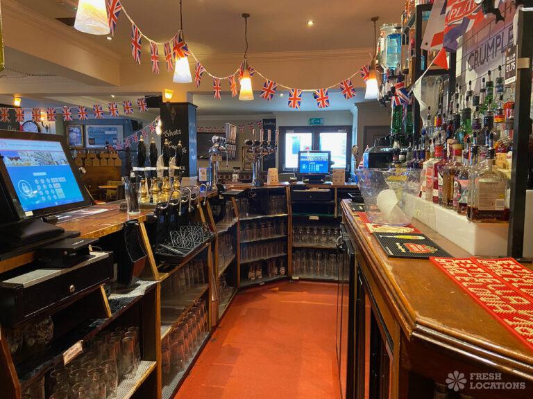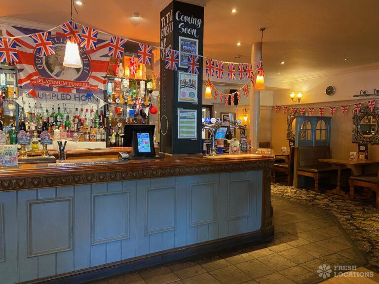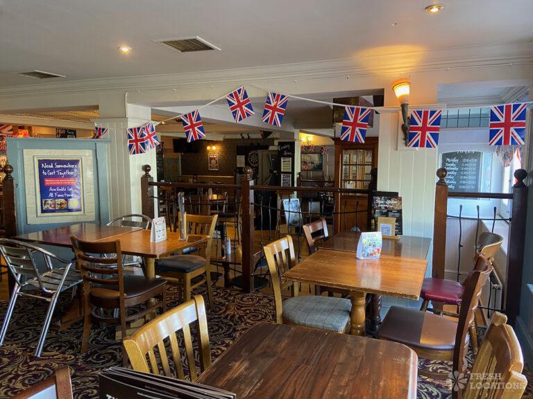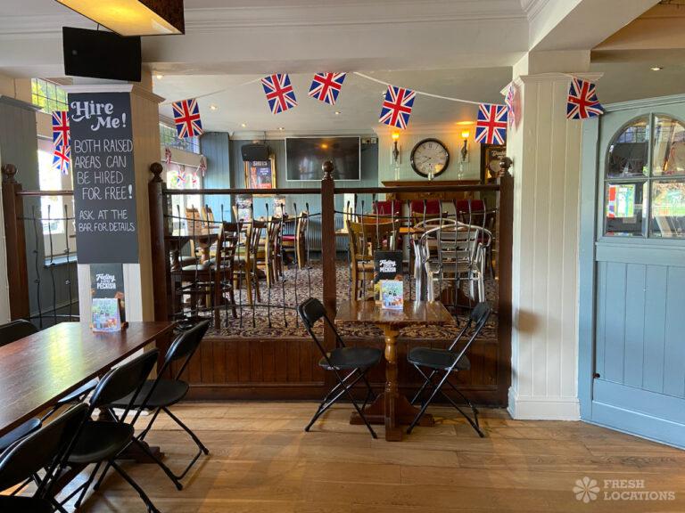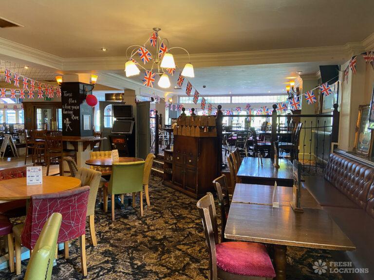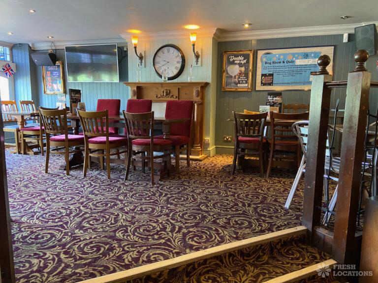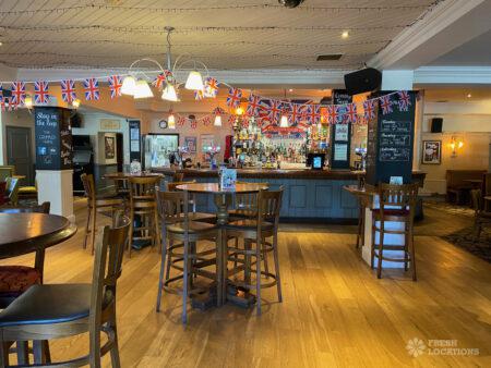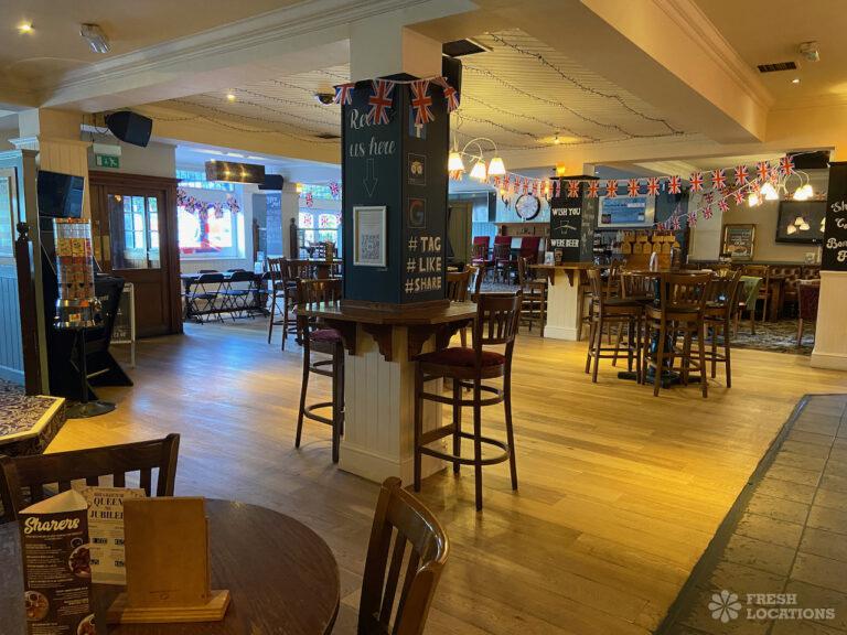 High street pub shoot location in Upminster. Traditional interior with indoor and outdoor seating and an industrial kitchen. London Borough of Havering.