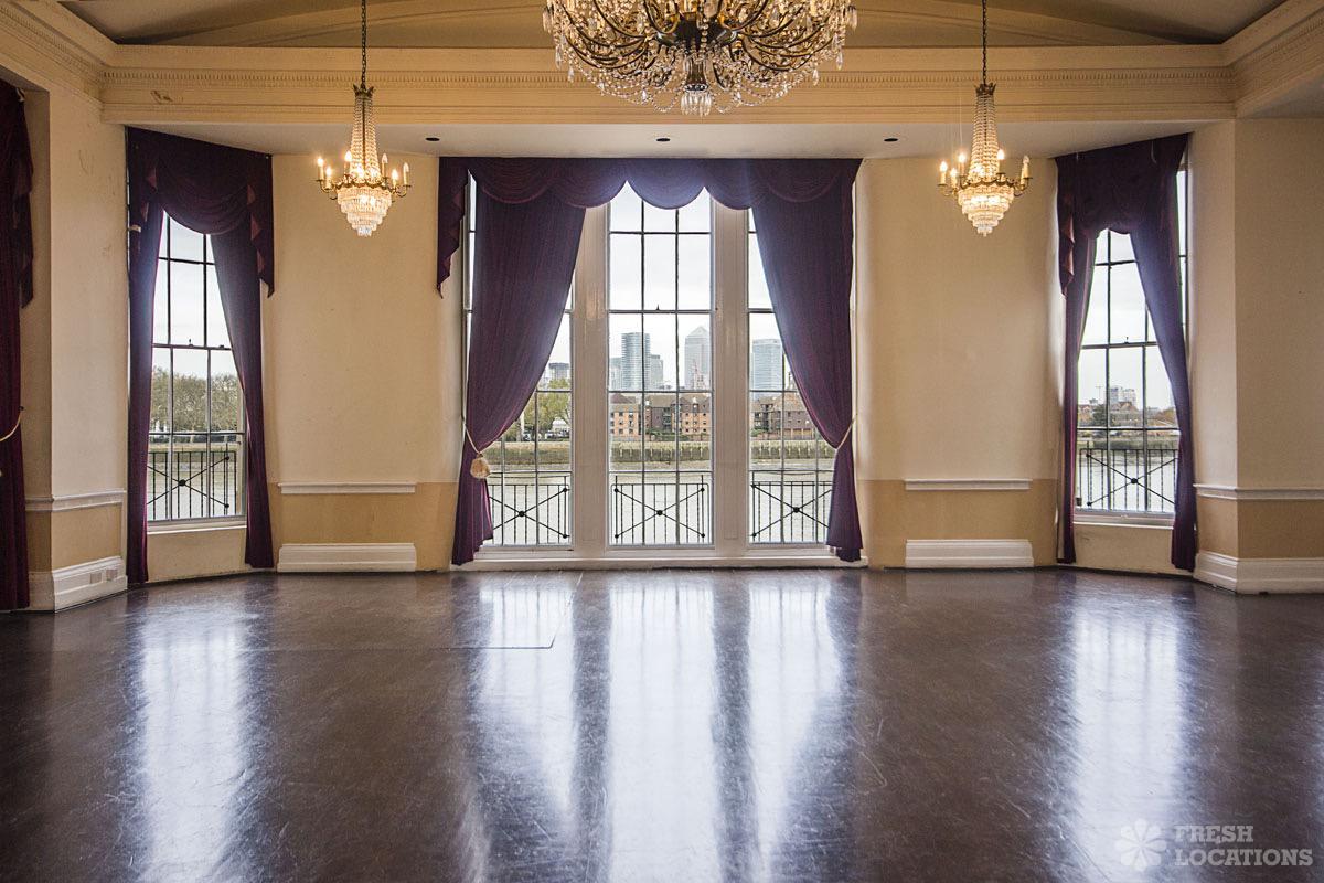 Wood Floors, Bay Window, City Views, Dark Wood Floor, Fireplace, Full Height Windows, StaircaseVictory Hall has a huge double ballroom with wooden floors, grand piano and views of the River Thames from the full height windows. The ballroom is connected to a saloon bar by a large, light drawing room. London Borough of Greenwich.