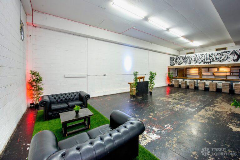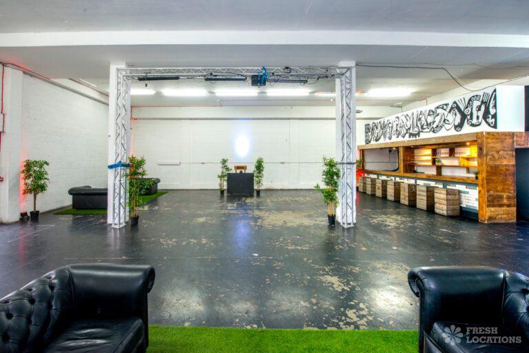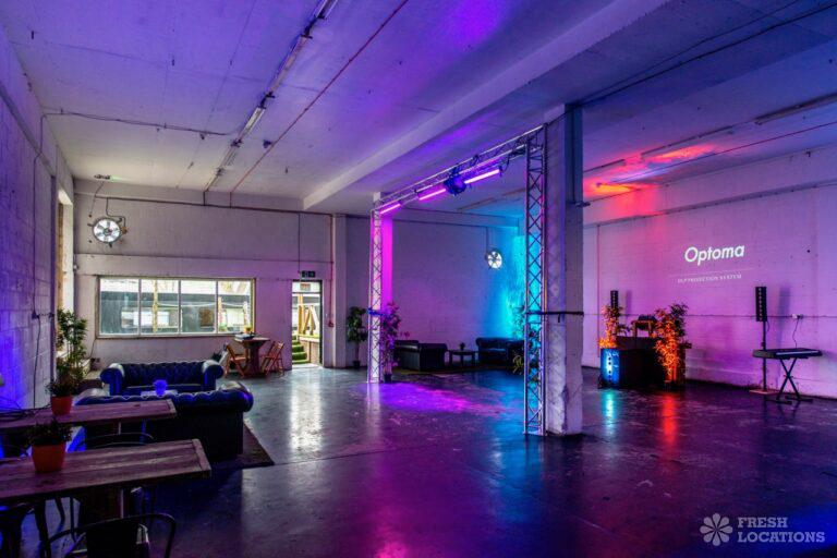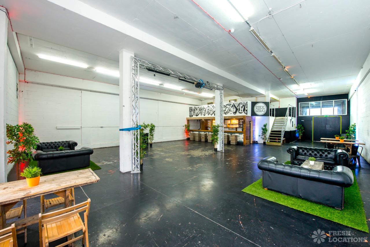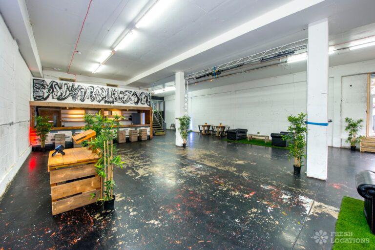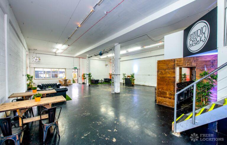 Versatile industrial warehouse space with high ceilings in Hackney, East London. Outside terrace overlooking the canal. Office space, green room and bathrooms available. Large car park and loading areas to accommodate crew parking. London Borough of Hackney.