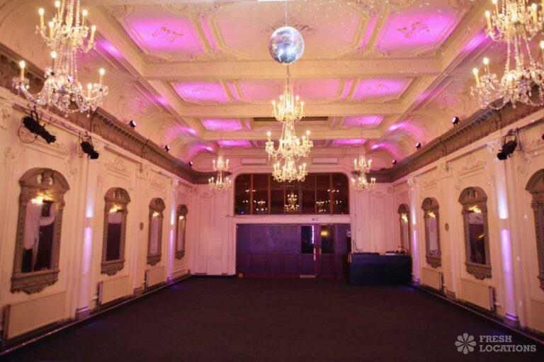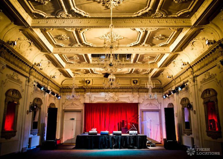 Tiled FloorLarge Edwardian dance hall with ornate period plasterwork, arched windows, crystal chandeliers, digital lighting rig and stage. In-house catering optional. Flexible availability. Versatile and plenty of characterar. London Borough of Hammersmith and Fulham.