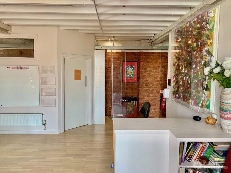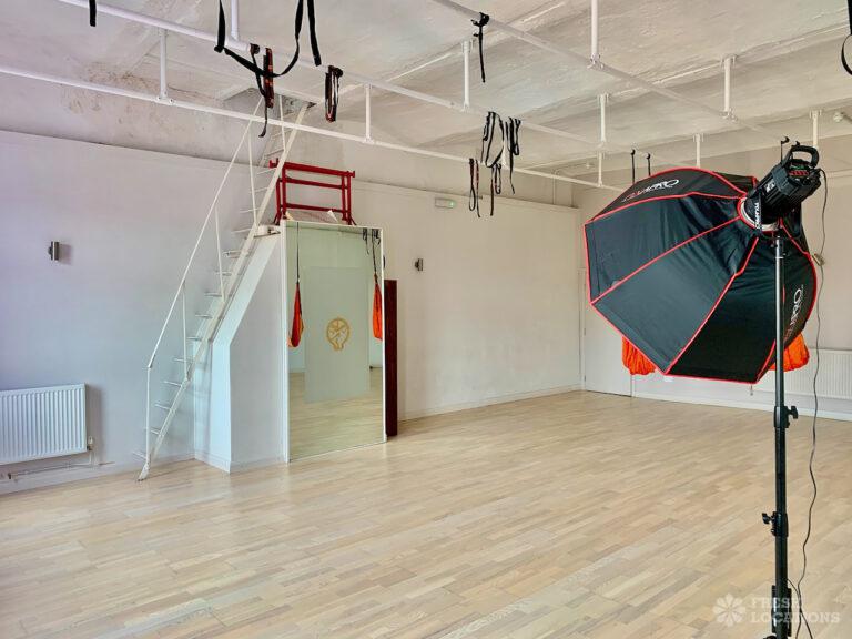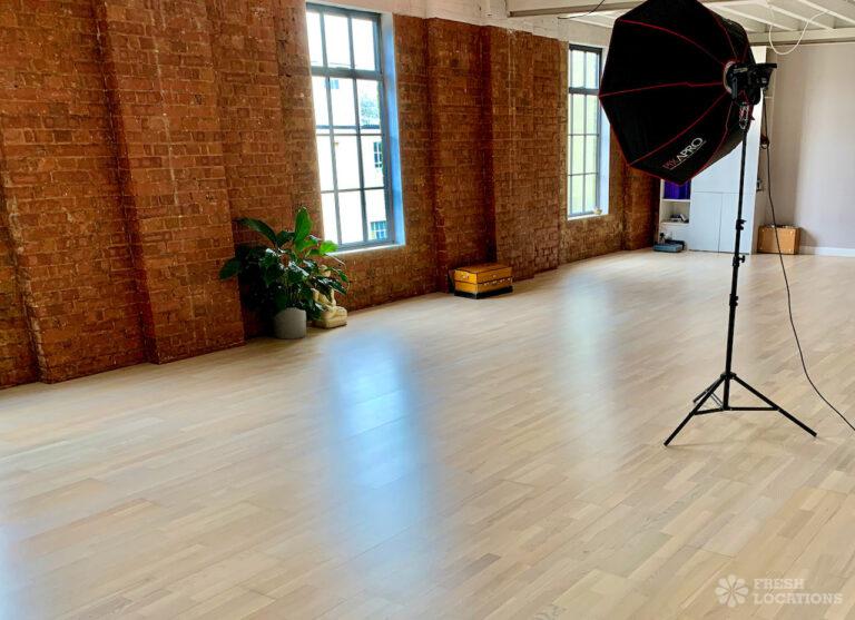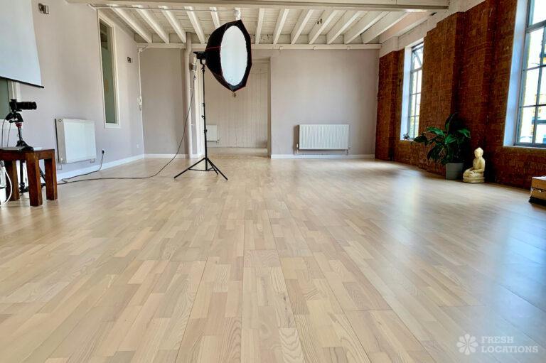 Spacious yoga studio shoot location in South East London. Three light-filled studios within a converted Victorian warehouse featuring light wood floors, reception area and changing rooms. London Borough of Lambeth.