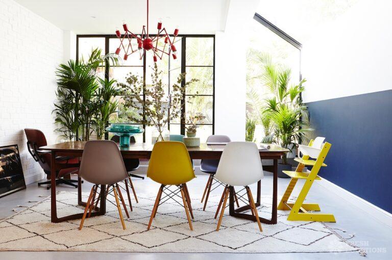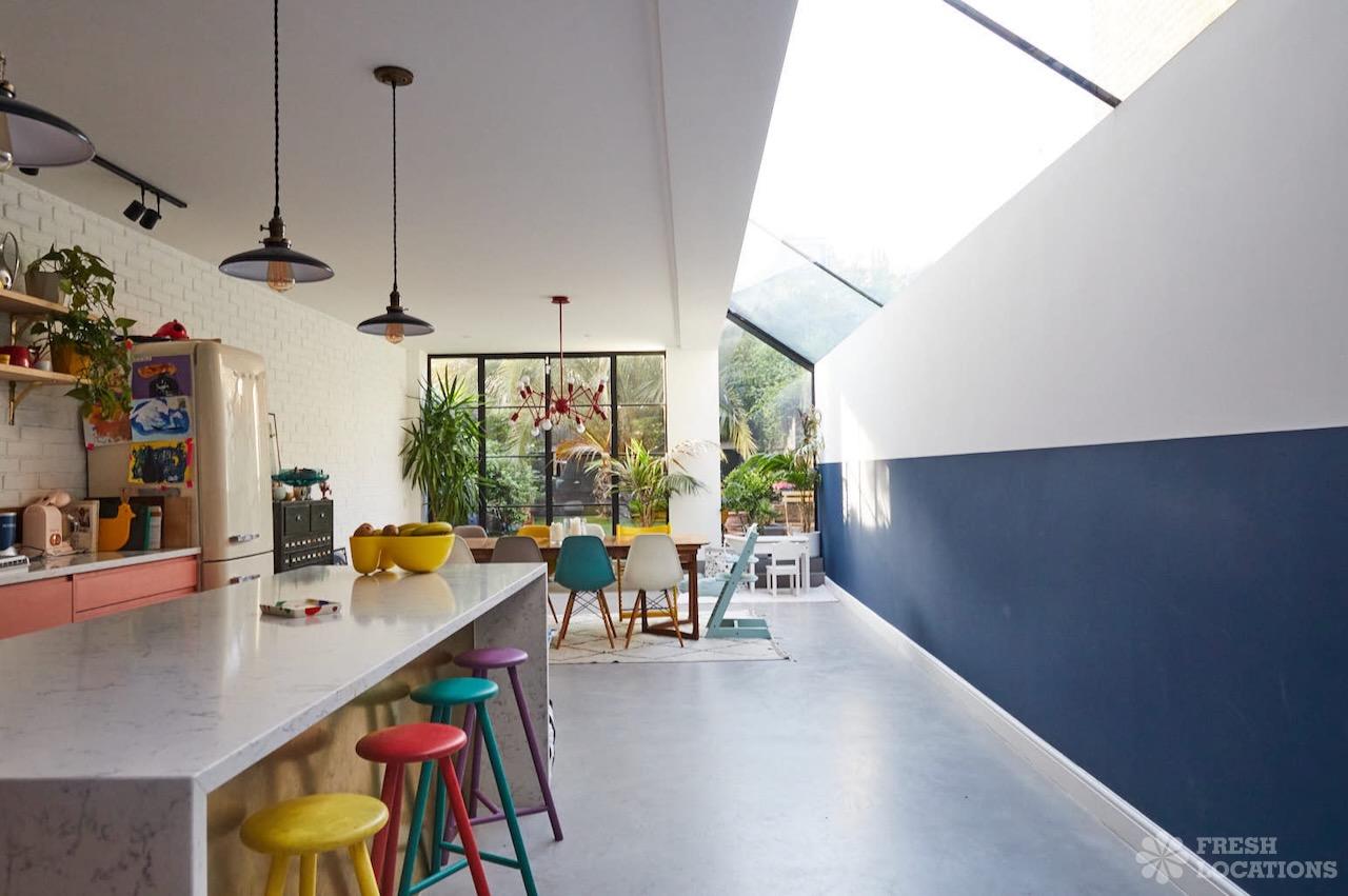Crittall, Bay Window, Colourful Kitchen, Dark Wood Floor, Fireplace, Garden, Large Bedroom, Large Kitchen, Light Wood Floor, Polished Concrete, SkylightsA Scandinavian styled terraced house in North West London. Featuring an open plan kitchen/dining area with crittal doors and polished concrete floors. London Borough of Brent.