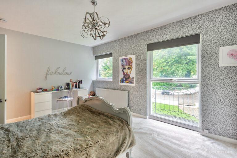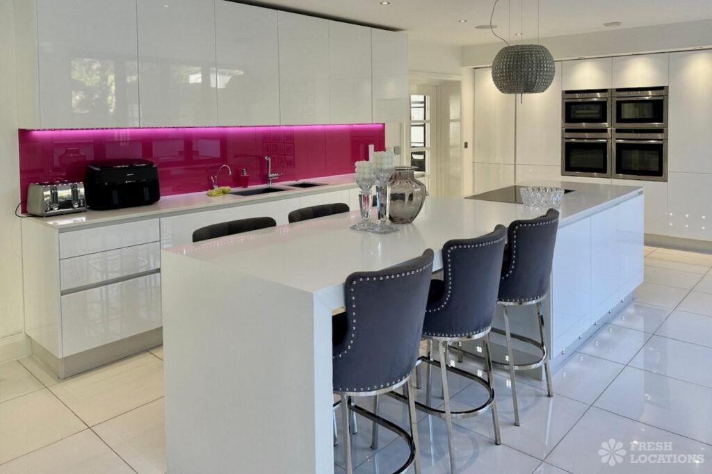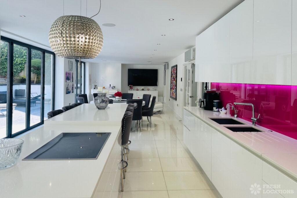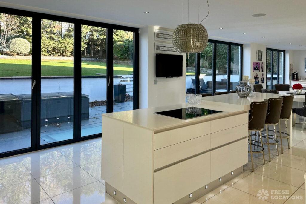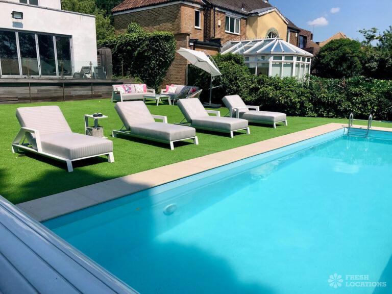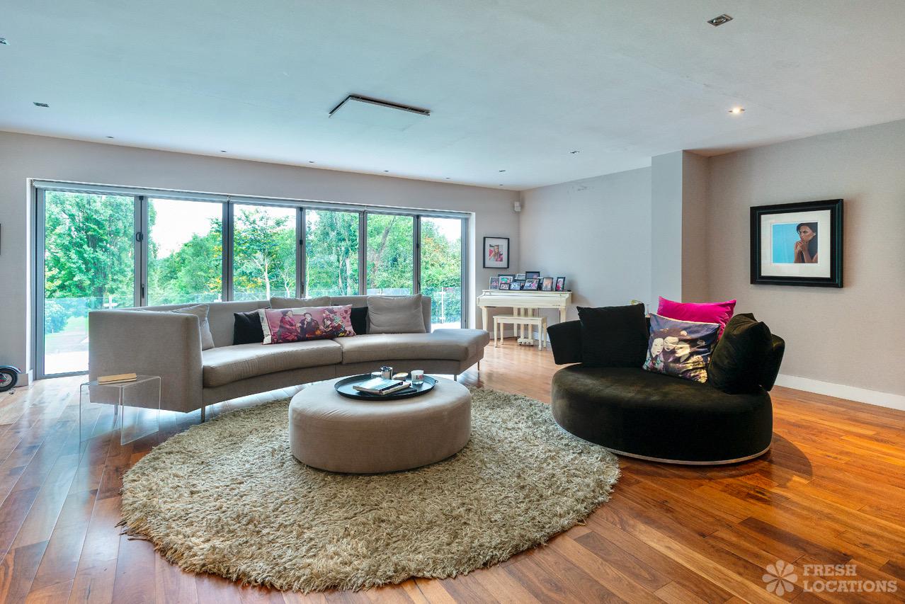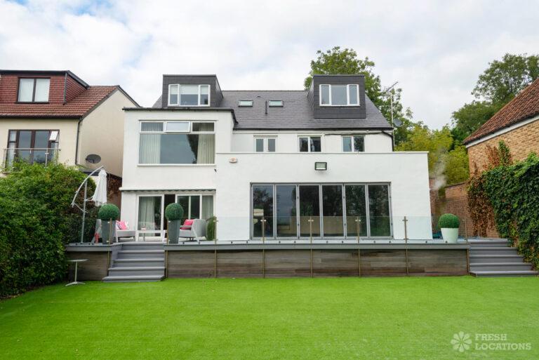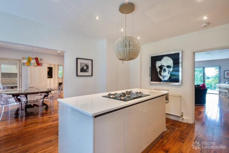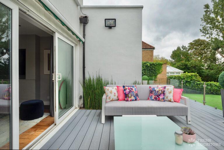 Wood Floors, Balcony, Decked Terrace, Driveway, Ensuite, Garden, Gas Hob, Island Cooker, Island Kitchen, Large Bathroom, Large Driveway, Light Wood Floor, Open Plan, Swimming Pool, Tiled Floor, Walk In Shower, Walk In Wardrobe, White KitchenFamily home shoot location. Large bright house with large modern living spaces and teenager’s bedrooms. Glass doors open fully onto the garden with patio and outdoor swimming pool. London Borough of Barnet.