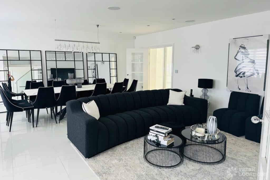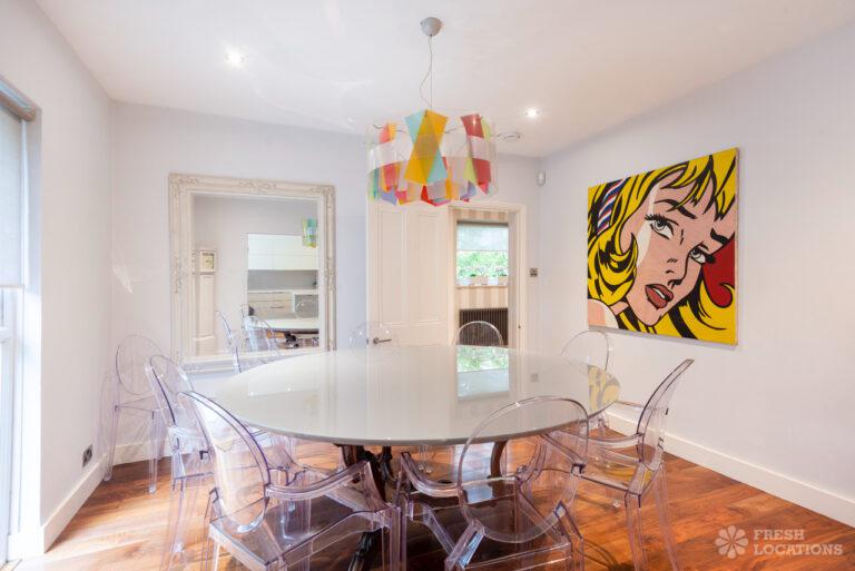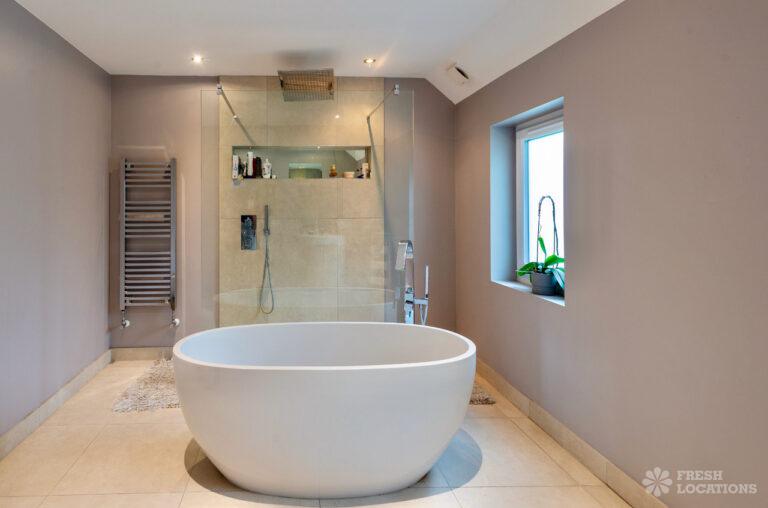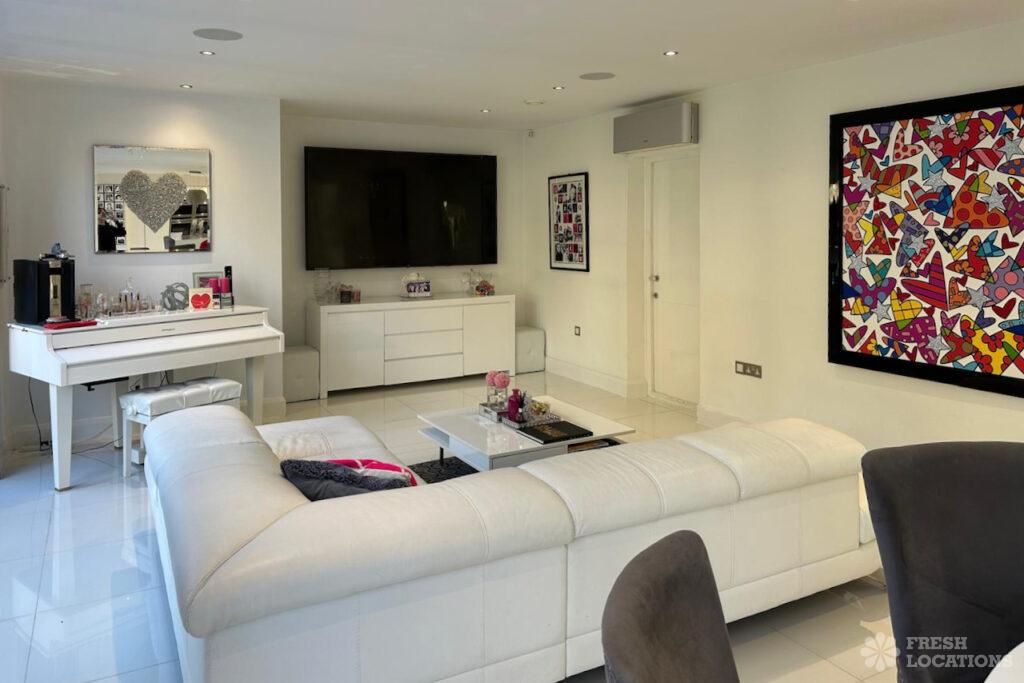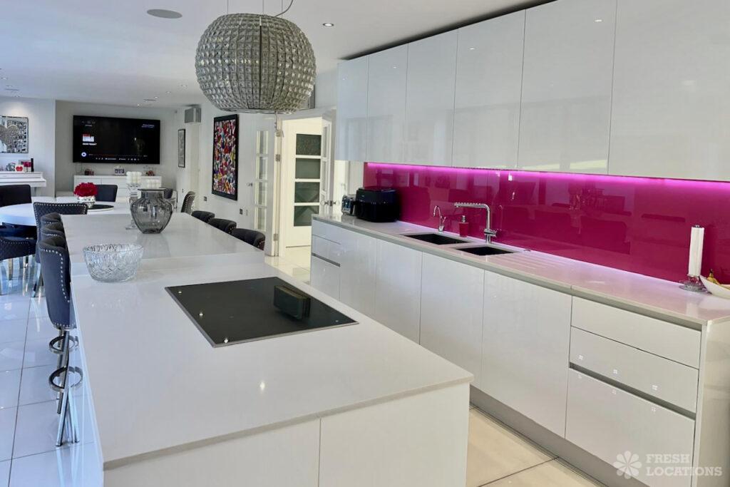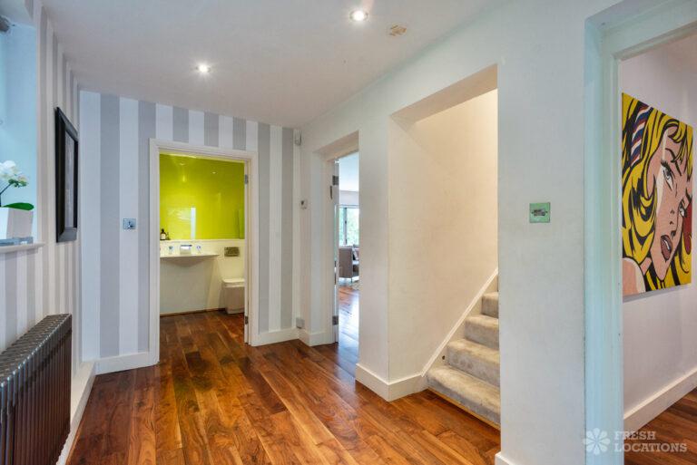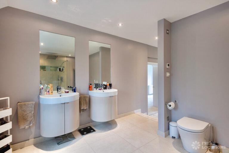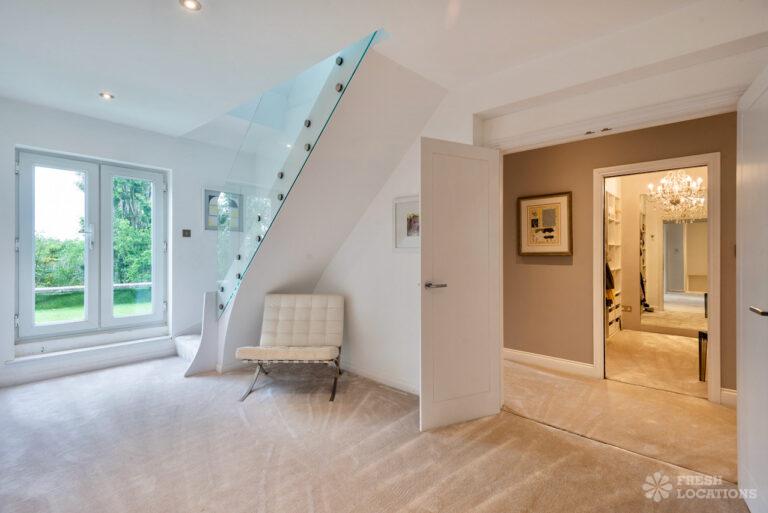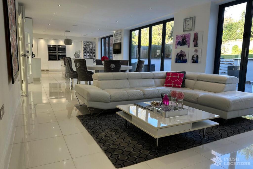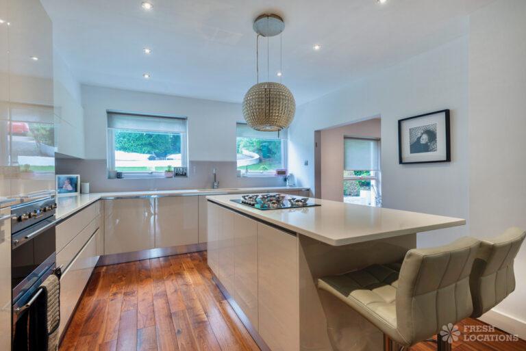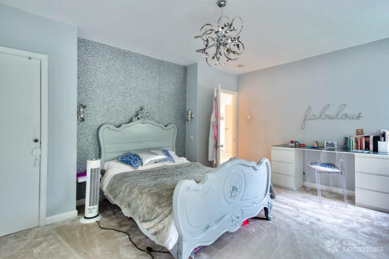 Wood Floors, Balcony, Decked Terrace, Driveway, Ensuite, Garden, Gas Hob, Island Cooker, Island Kitchen, Large Bathroom, Large Driveway, Light Wood Floor, Open Plan, Swimming Pool, Tiled Floor, Walk In Shower, Walk In Wardrobe, White KitchenFamily home shoot location. Large bright house with large modern living spaces and teenager’s bedrooms. Glass doors open fully onto the garden with patio and outdoor swimming pool. London Borough of Barnet.