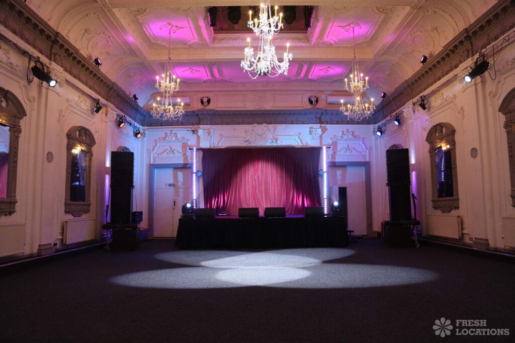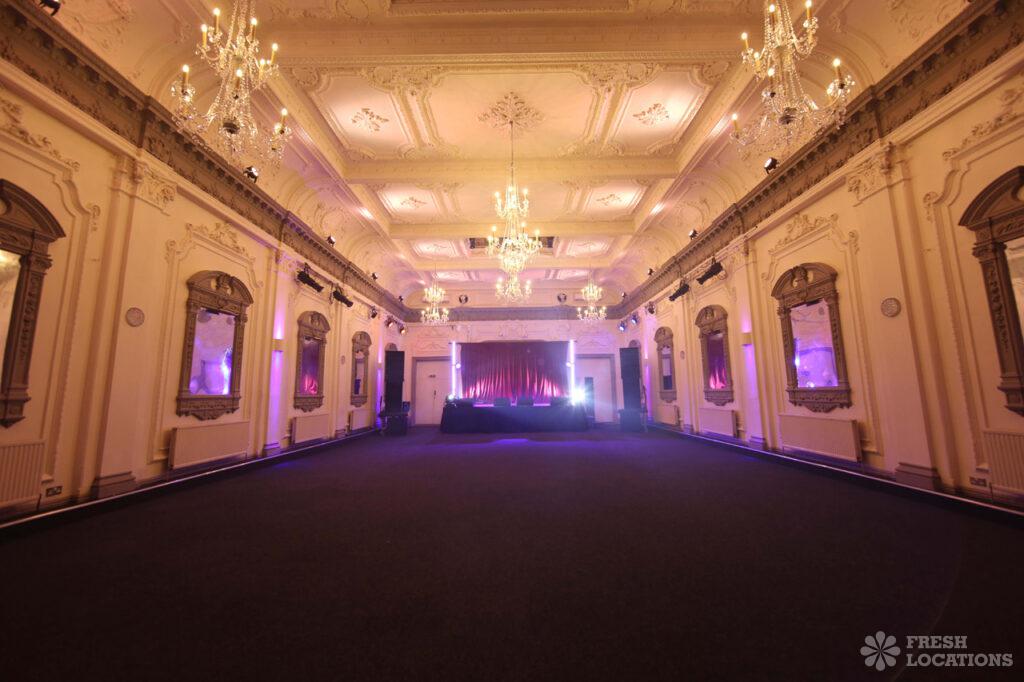 Large Edwardian dance hall with ornate period plasterwork, arched windows, crystal chandeliers, digital lighting rig and stage. In-house catering optional. Flexible availability. Versatile and plenty …