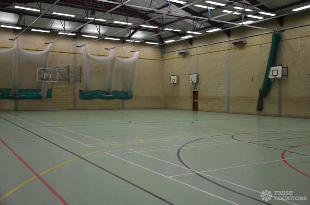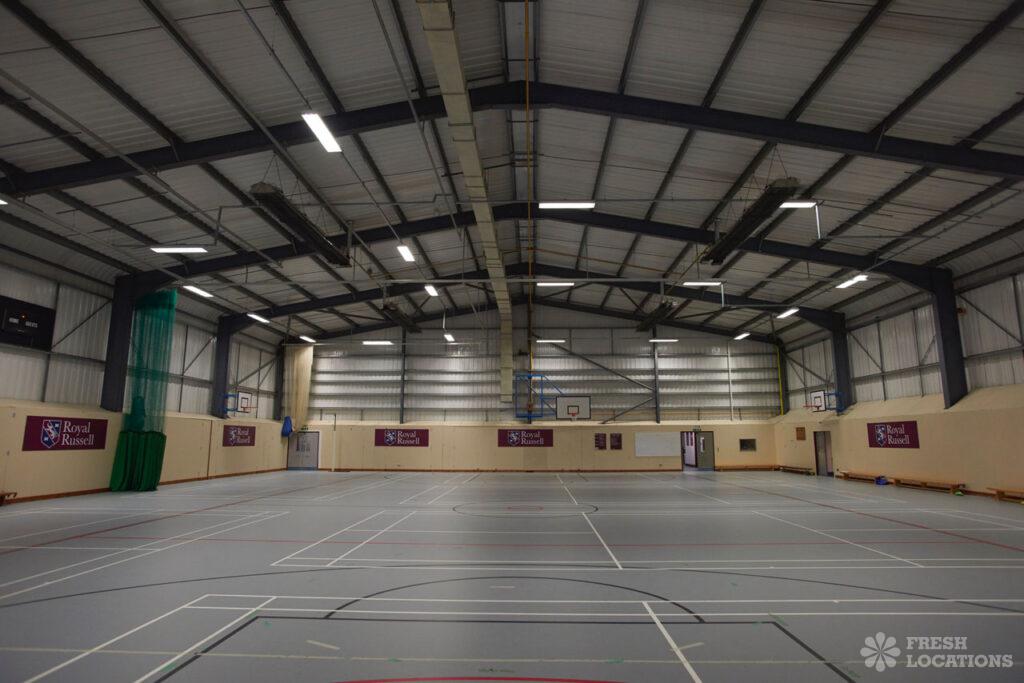 Large sports centre shoot location. Featuring gym, sports hall, indoor and outdoor tennis courts, football pitch, reception area and locker room. London Borough of Sutton.