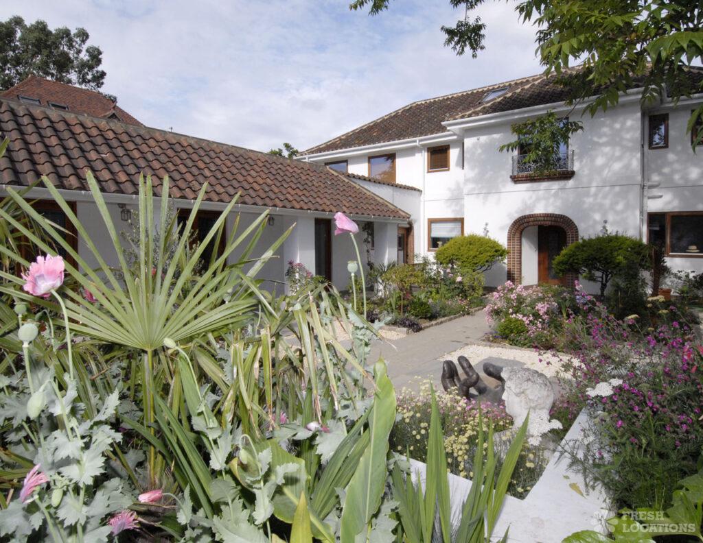 Light and bright shoot location house near Hampton Wick with a meditteranean courtyard garden. Large kitchen/dining area with bi fold doors and a decked terrace …