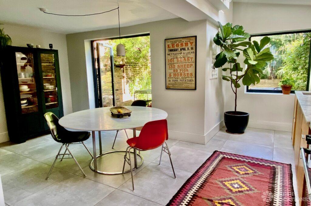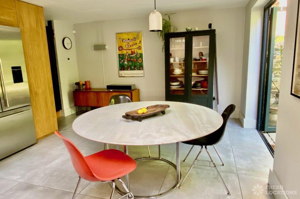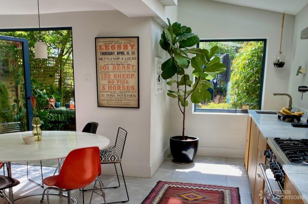 Terraced house shoot location with a lived in feel in South East London. Open plan kitchen/dining/living room with double doors opening onto a garden with …