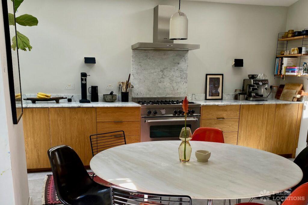 A stylish and modern shoot location in East London. This property features a large kitchen with a dining area, leading out to a garden. Upstairs …