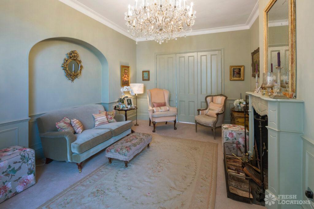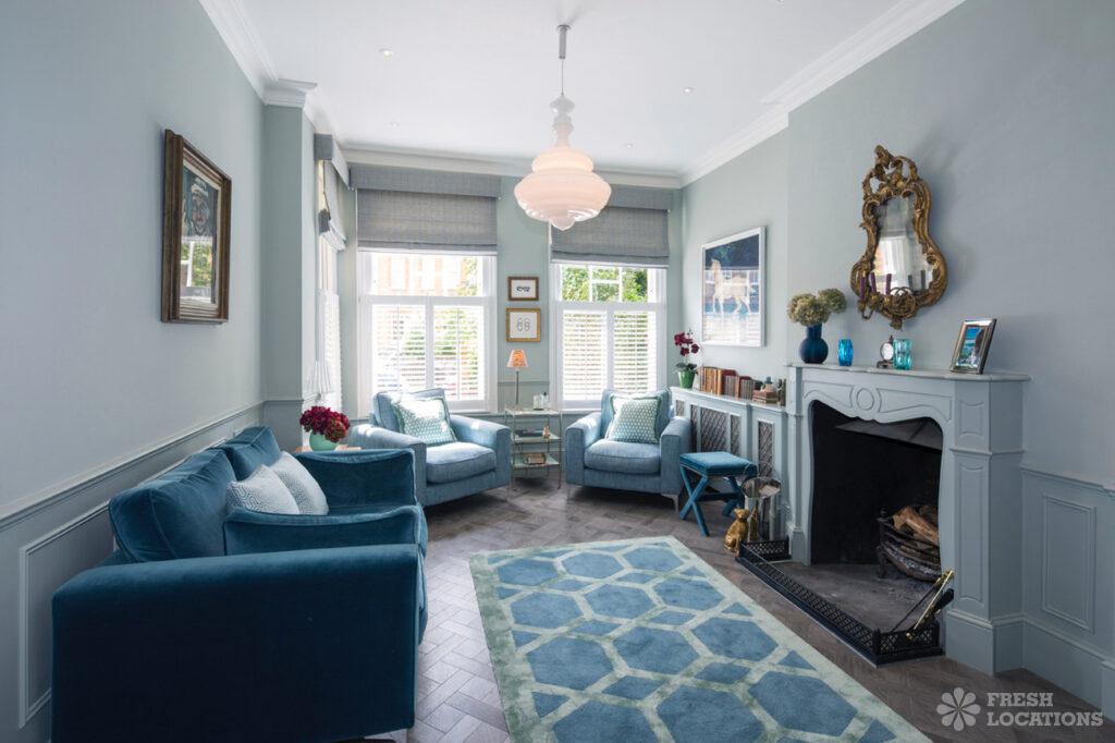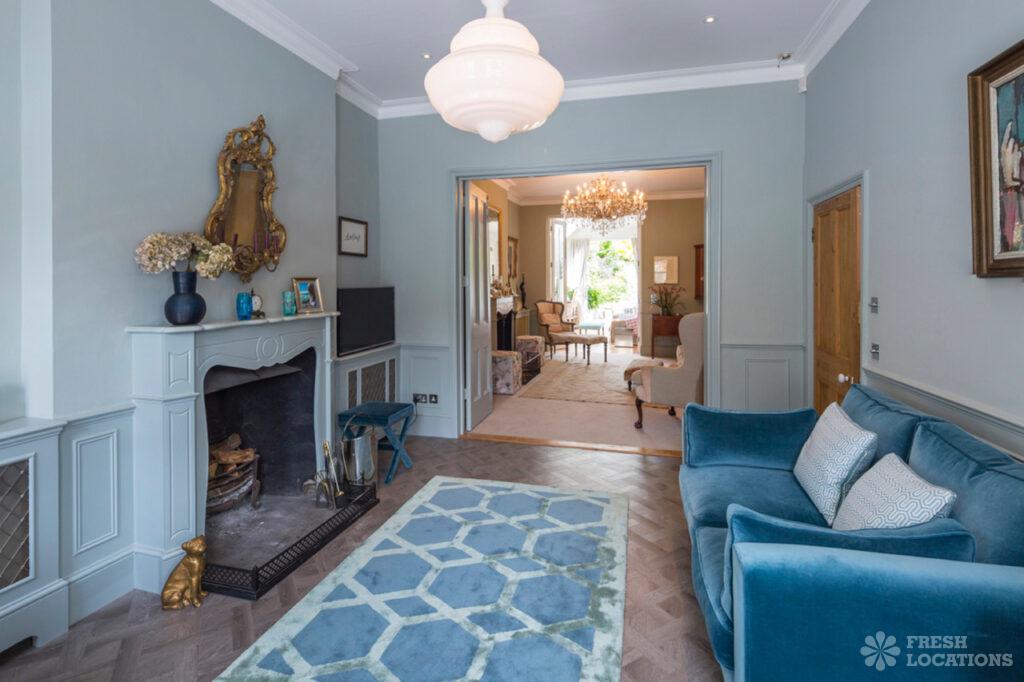 Large Victorian family house shoot location in West London with period features including fireplaces and a beautifully decorated living room ceiling. Features include multiple bathrooms, …