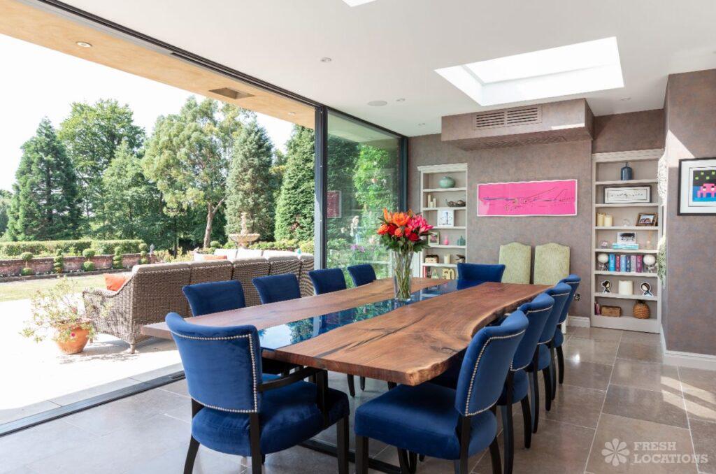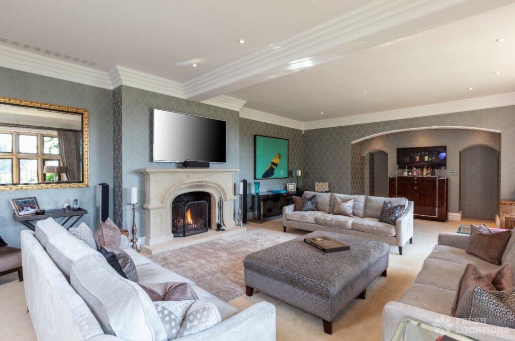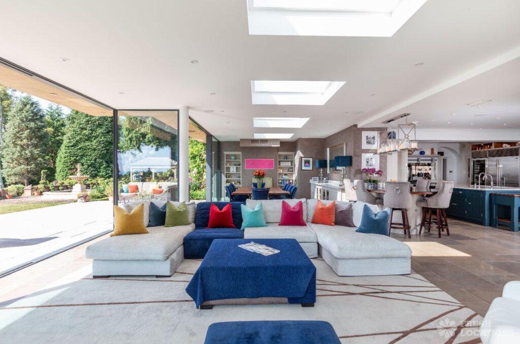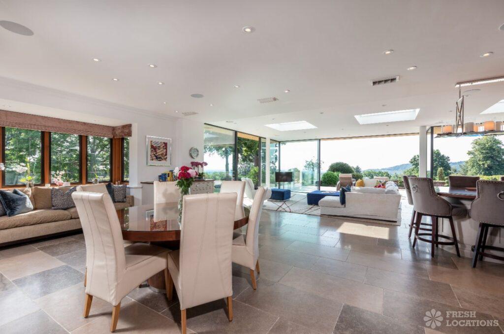 Large detached filming location in Surrey with a modern glass extension set in 8 acres of grounds with views over the South Downs. Other features …
