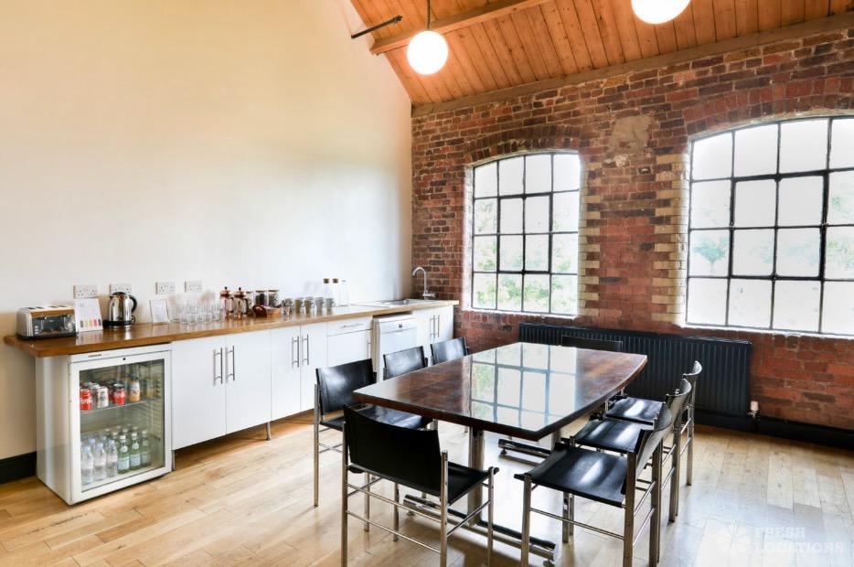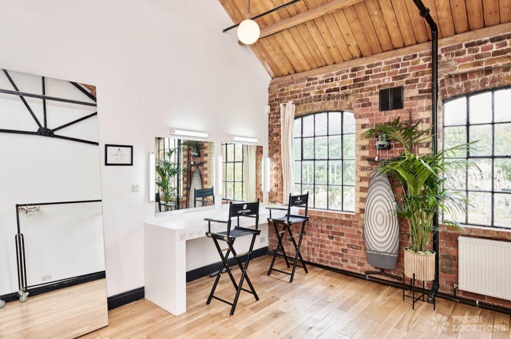 Large photography studio with dressing room and crew dining area. Features include exposed brick, light wood floor and high ceilings. London Borough of Hammersmith and …