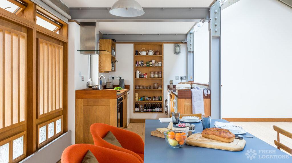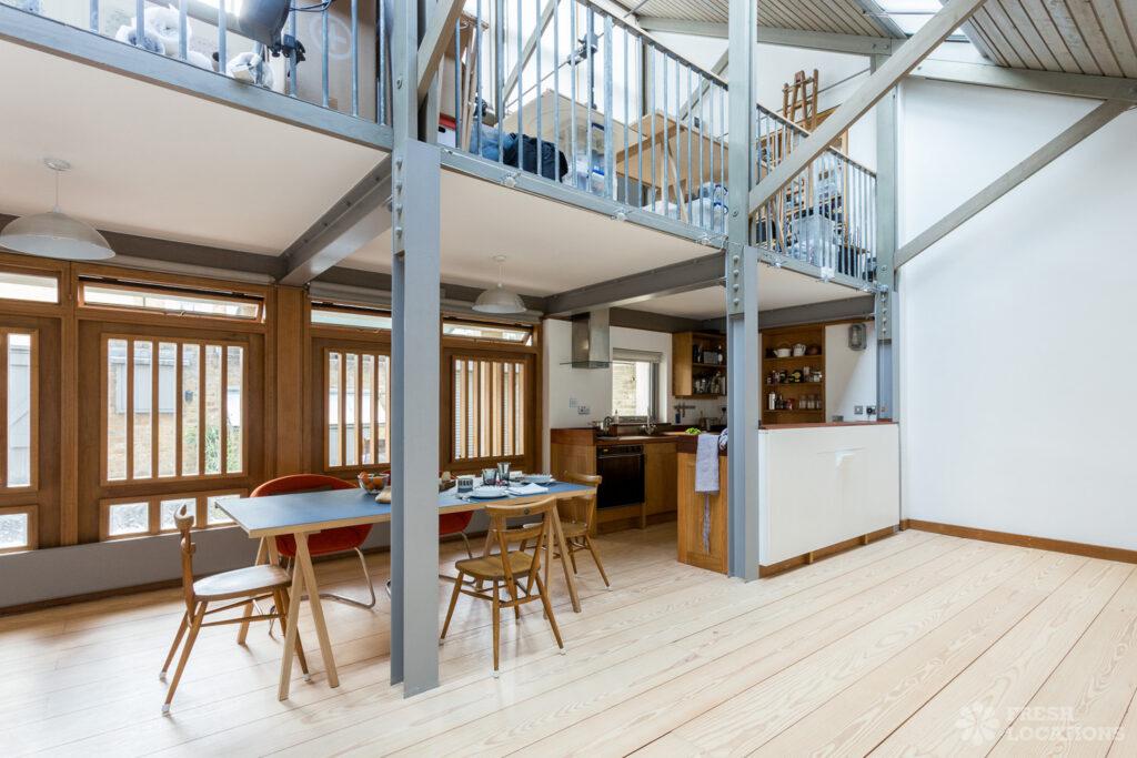 Open plan loft in North London. This shoot location features a professional kitchen with large windows and hanging pots, a dining area and an attached …