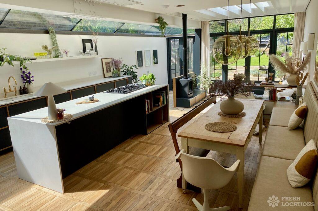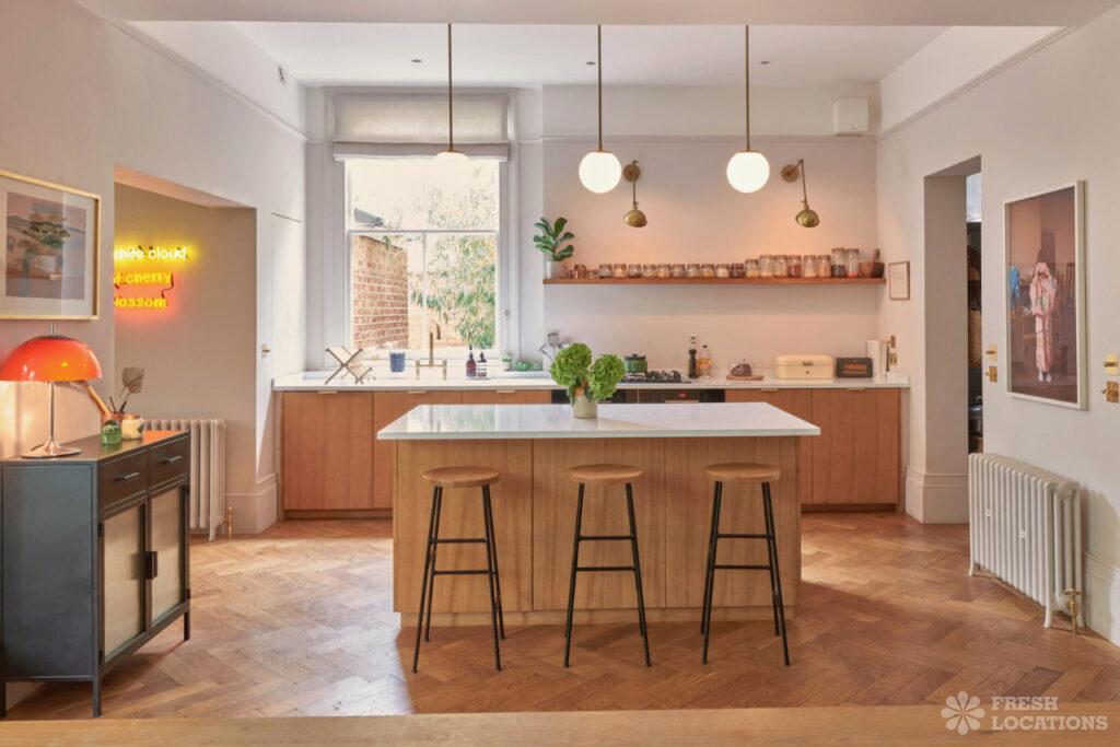 A colourful Arts and Crafts style house shoot location in North London. This property has an open plan living area with a colourful kitchen island …