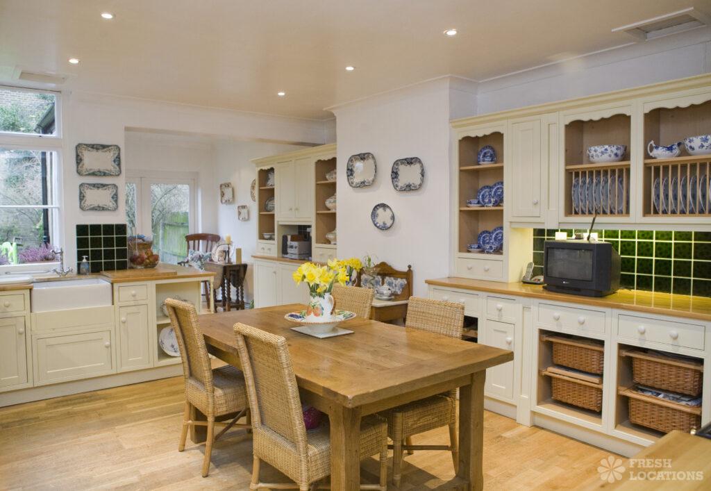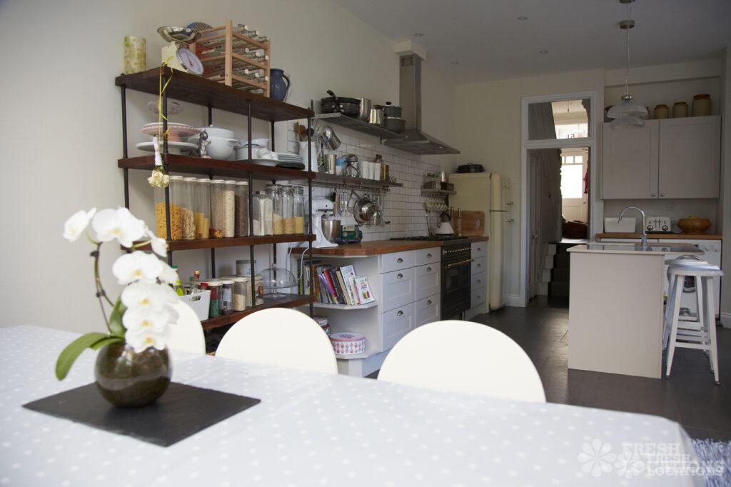 Great family home shoot location in South West London. Large, ordinary kitchen diner with wooden worktops and light kitchen units. Multiple, lived in living rooms …