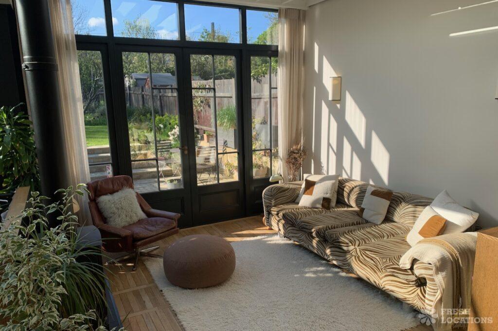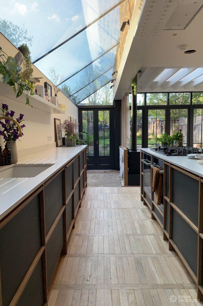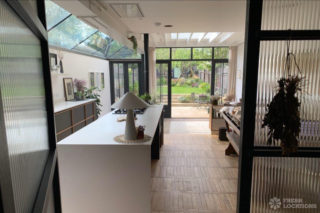 Large, modern family home filming location in North West London. Large kitchen extension with an exposed brick wall and crittall doors leading out the spacious …